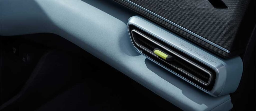 Ventilasi AC BYD SEAGULL dirancang dengan garis tegas dan aksen warna mencolok bergaya “cyberpunk,” menghadirkan nuansa futuristik yang penuh energi dan memperkuat karakter interior yang modern dan berani.